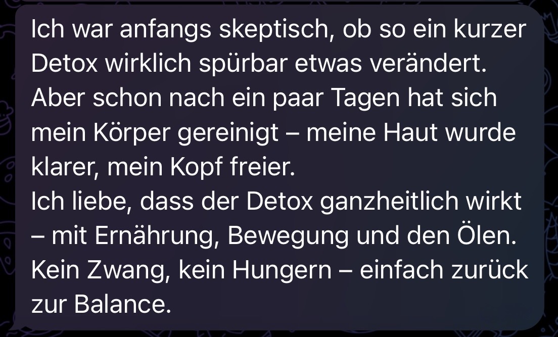 Raus mit Applaus ist ein 10-tägiger Detox-Kurs mit Heilfasten, Parasitenausleitung, ätherischen Ölen und natürlichen Anwendungen. Du bekommst eine klare Struktur, tägliche Begleitung und kraftvolle Tools für eine tiefgehende körperliche und emotionale Reinigung.